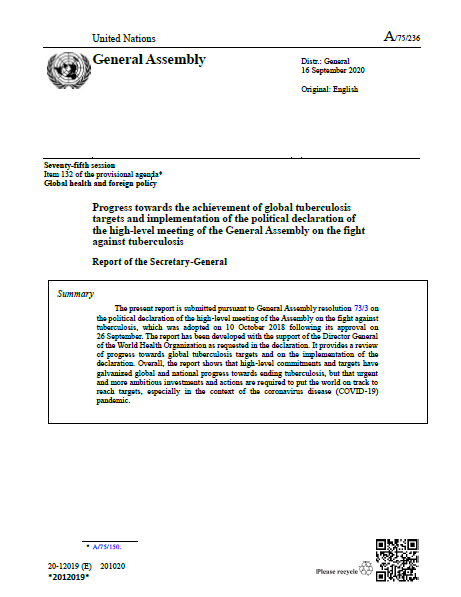 A new report has been released today by the United Nations Secretary-General António Guterres, titled Progress towards the achievement of global tuberculosis targets and implementation of the political declaration of the high-level meeting of the General Assembly on the fight against tuberculosis. The report stresses that high-level commitments and targets have galvanized global and national progress towards ending TB, but urgent and more ambitious investments and actions are required, especially in the context of the COVID-19 pandemic. The report was developed with the support of the Director General of the World Health Organization (WHO) as requested in the political declaration of the 2018 UN High Level Meeting on TB.